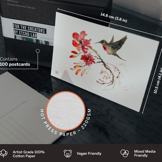 This pack includes 100 hot press paper postcards. These postcards are vegan friendly and use 220g acid-free, artist-grade 100% cotton paper - the same paper that is used in our Hot Press Etchr Sketchbooks.