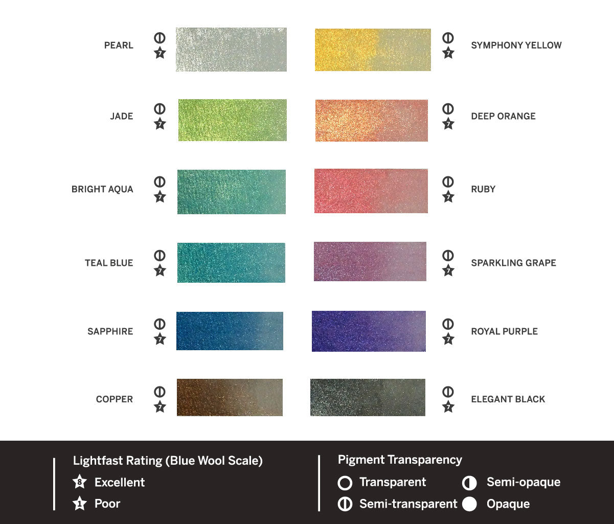 - 12Â half pans: Pearl, Jade, Bright Aqua, Teal Blue, Sapphire, Copper, Symphony Yellow, Deep Orange, Ruby, Sparkling Grape; Royal Purple, Elegant Black