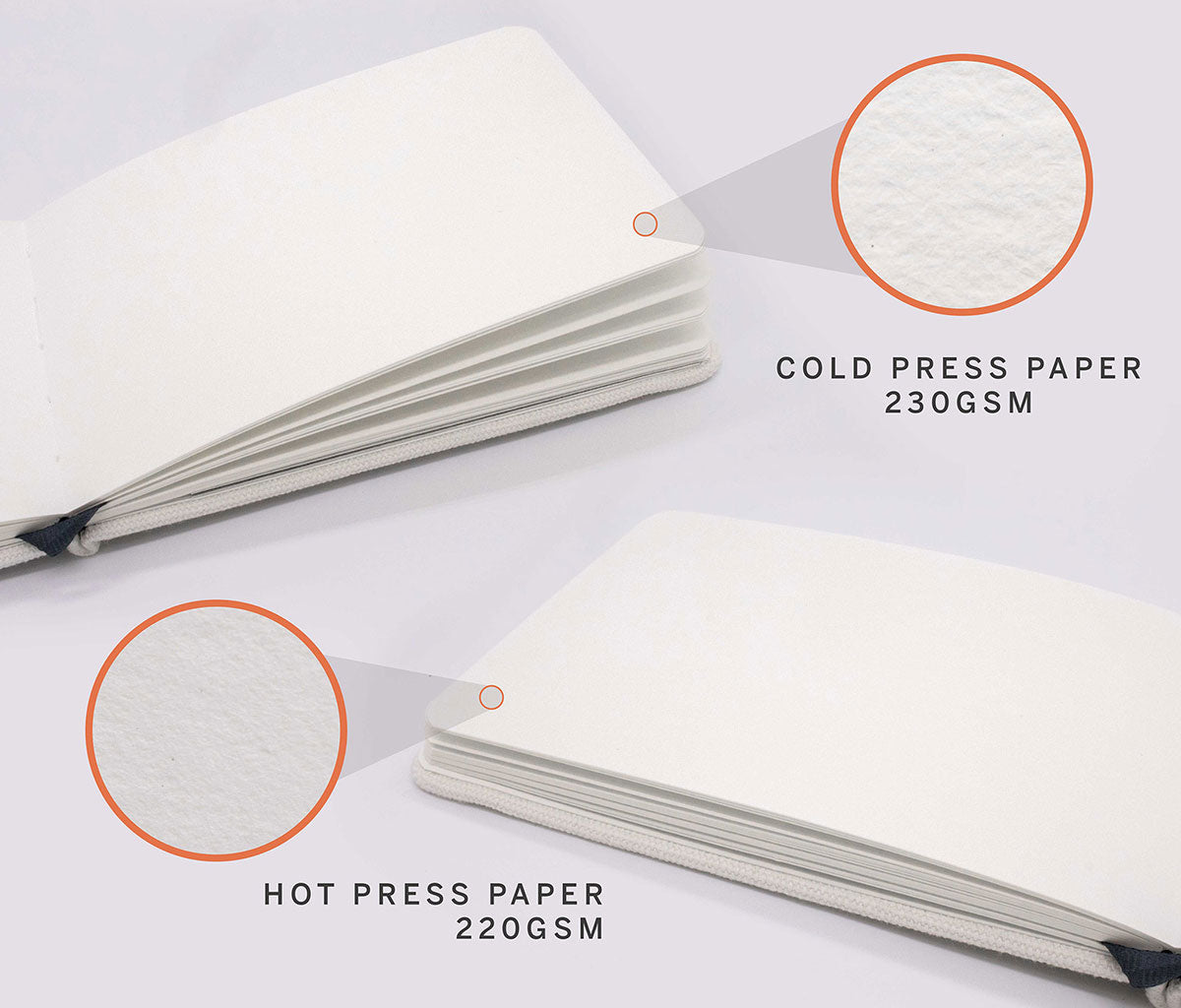These sketchbooks use acid-free, 100% cotton artist-grade paper. The paper tone is traditional white. Paper thickness is 230gsm (~110lbs) for cold press or 220gsm (~100lbs) for hot press.