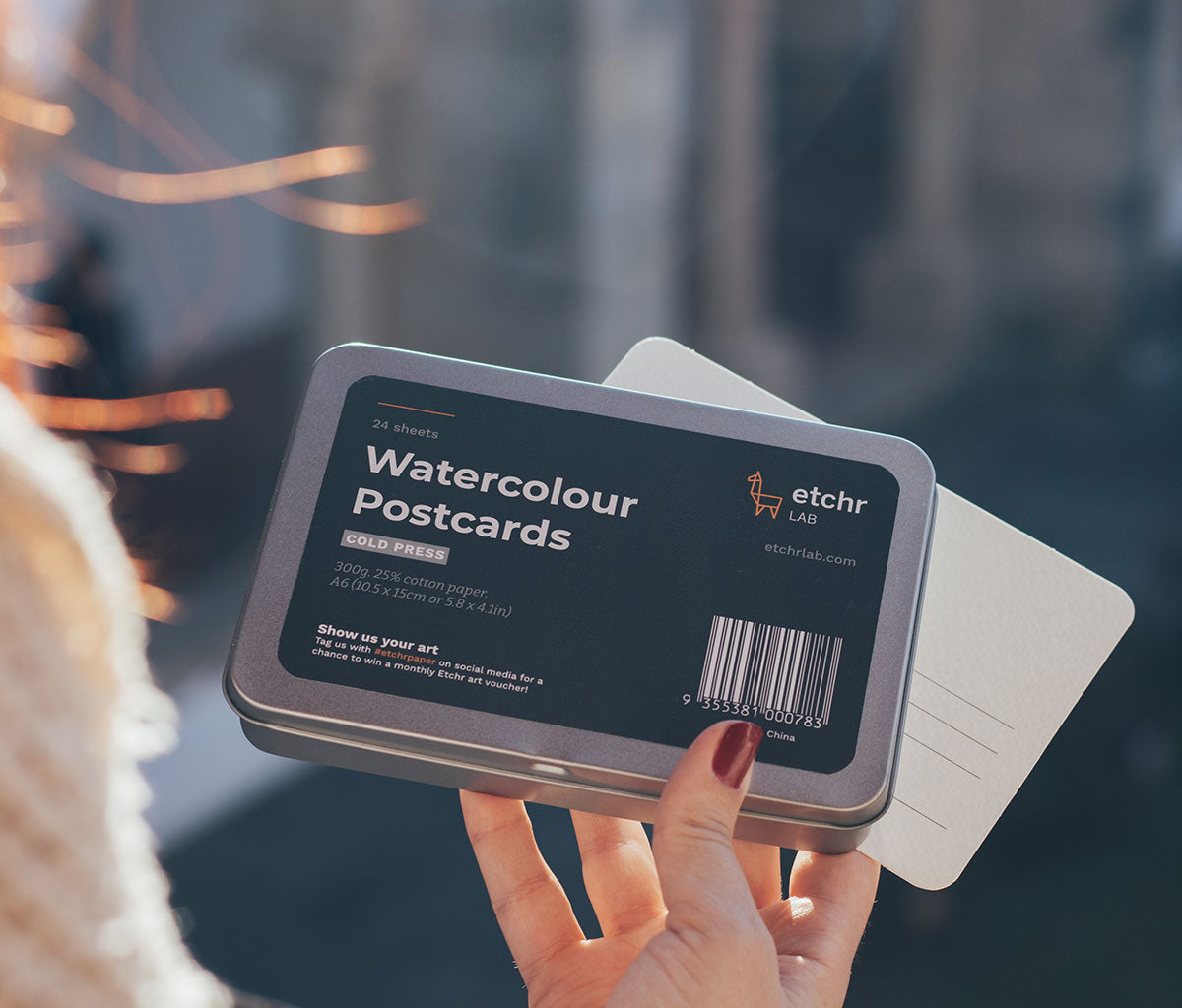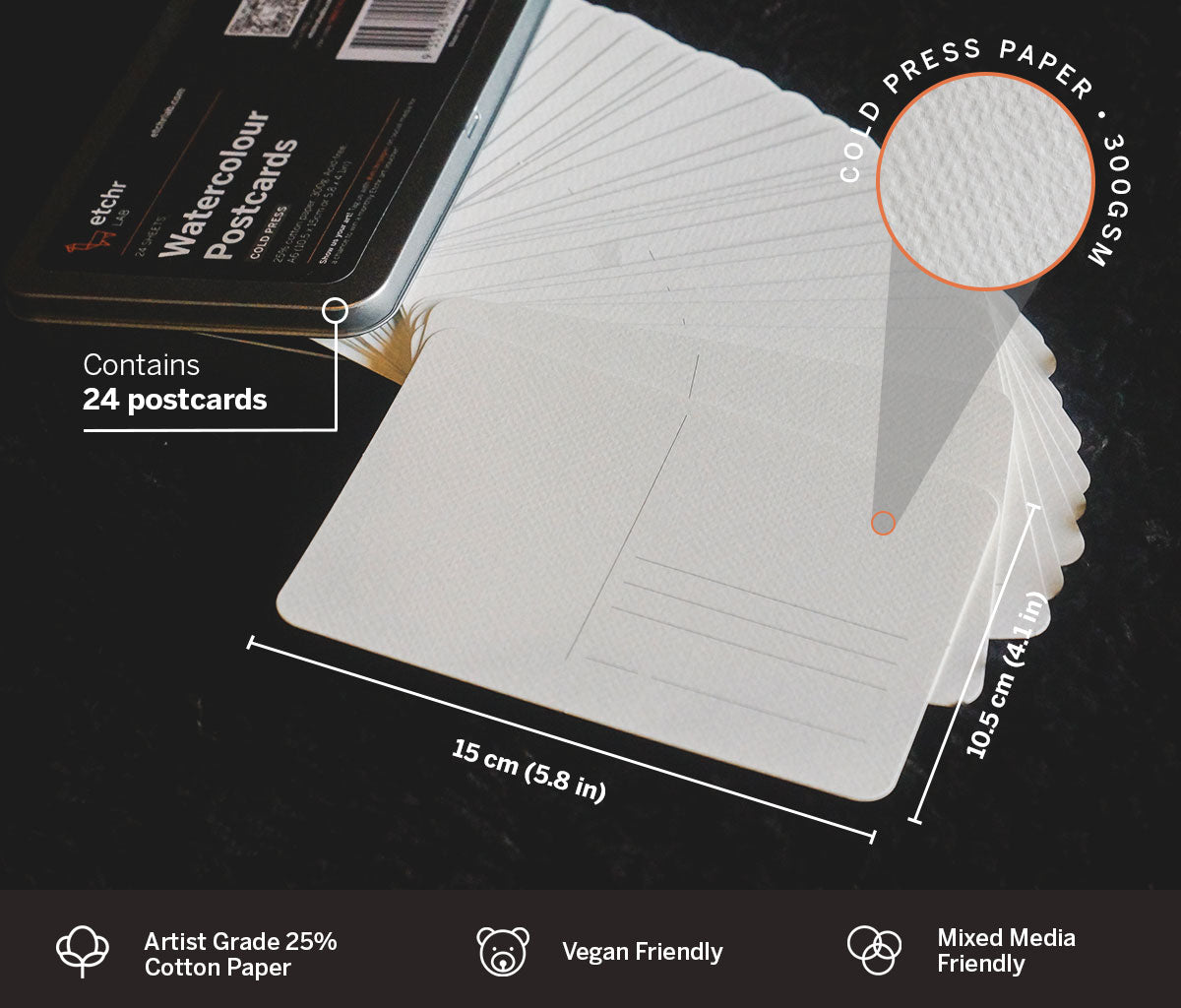 This pack includes 24 cold press paper postcards. These postcards are vegan friendly and use 300g acid-free, artist grade 25% cotton paper.