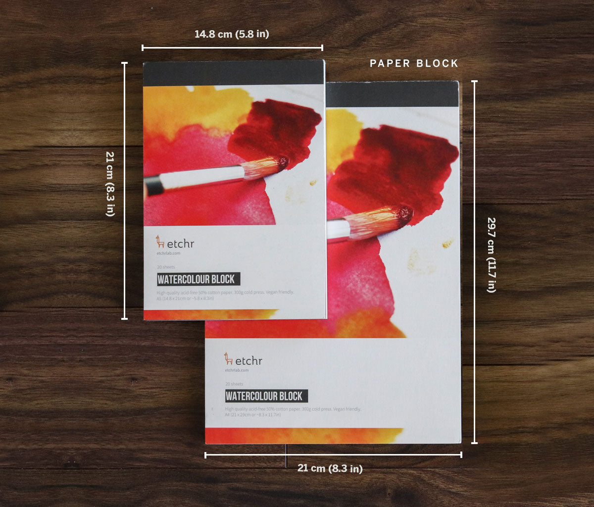 This A5 paper block is 14.8 x 21cm (or ~ 5.8 x 8.3in) and weighs 170g (0.37 pounds).