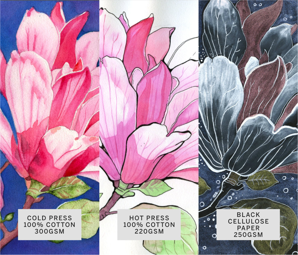 - Hot press; 100% cotton acid-free paper; 220gsm (16 pages)