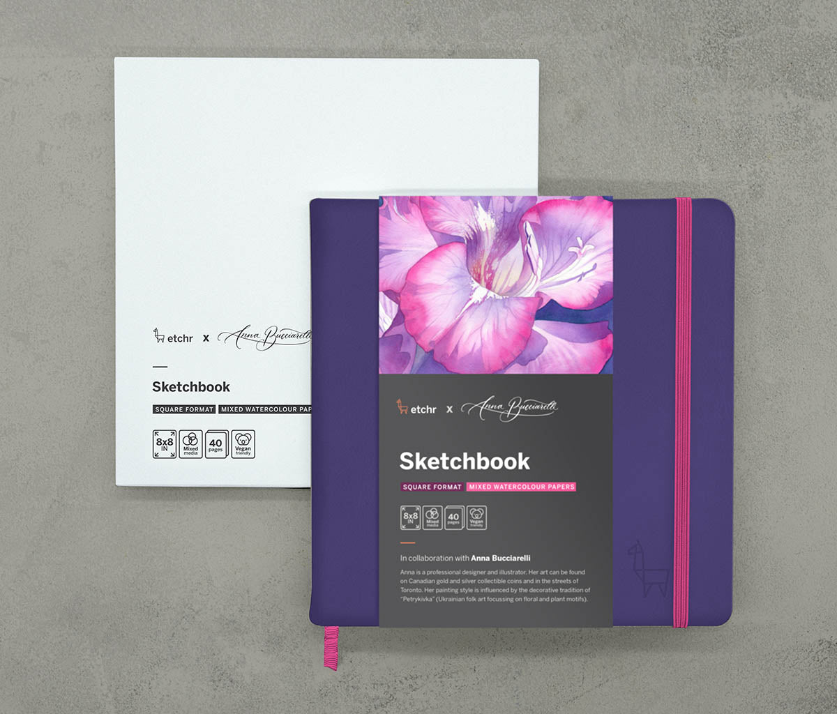 Anna loves to push herself to experiment with new materials and to understand their effect on colour and form. This innate interest led her to suggest that Etchr create a sketchbook that would provide artists permission to experiment with the application of pigment on different surfaces.
