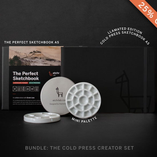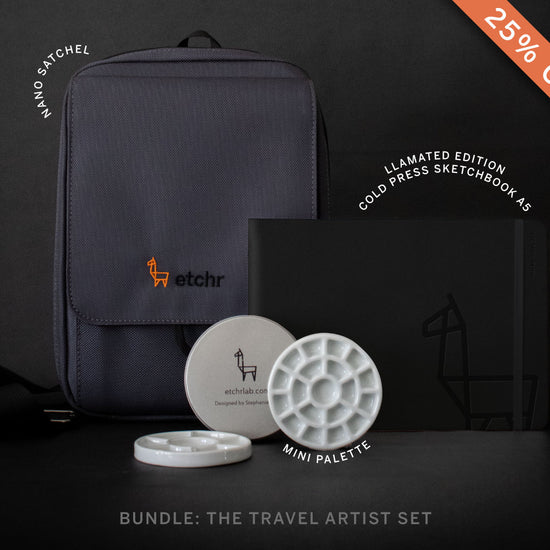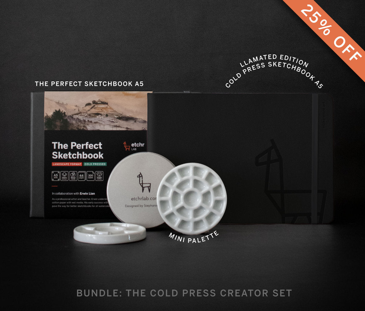 Two exclusive bundles created for artists who want reliable tools with a collectible touch. Each set includes our new Llamated Edition sketchbook — black cover, 300gsm cold press paper, and hand-torn deckled edges — created especially for this seasonal offer.