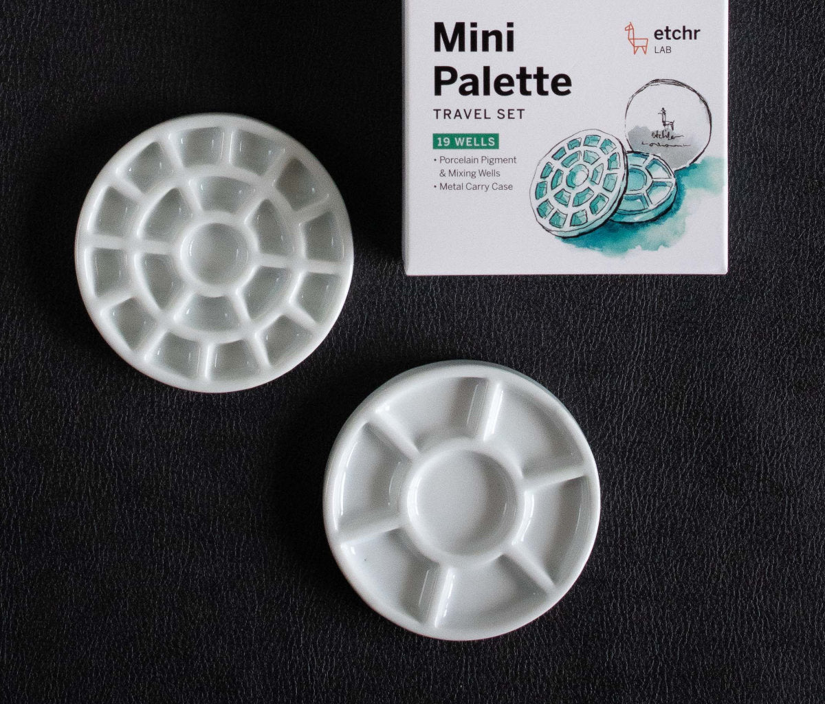 Designed in collaboration with Californian artist Stephanie Law, the Pocket Palette is a travel-sized watercolourist companion designed to carry 7 half-pans and 2 mixing wells. It has a modular design that includes magnetically secured removable half-pan and mixing-well inserts. When these inserts are removed, the case can also be used to carry the Etchr Mini Palette.