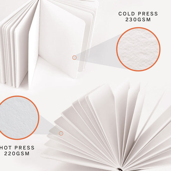 These sketchbooks use acid-free, 100% cotton artist-grade paper. The paper tone is traditional white. Paper thickness is 230gsm (~110lbs) for cold press or 220gsm (~100lbs) for hot press.