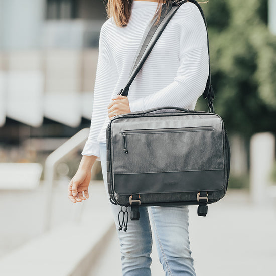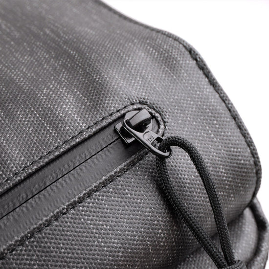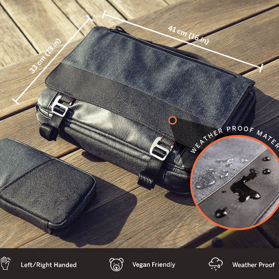 All components in this item are vegan friendly. The external material of the Art Satchel uses a dark grey polyester with black Toughtek front flap accents, and Toughtek for hardwearing areas. The internal materials are felt and ripstop material. The zips are YKK matte black water-resistant.