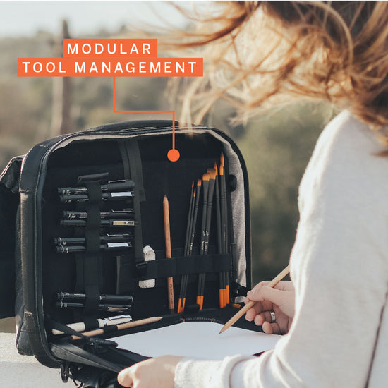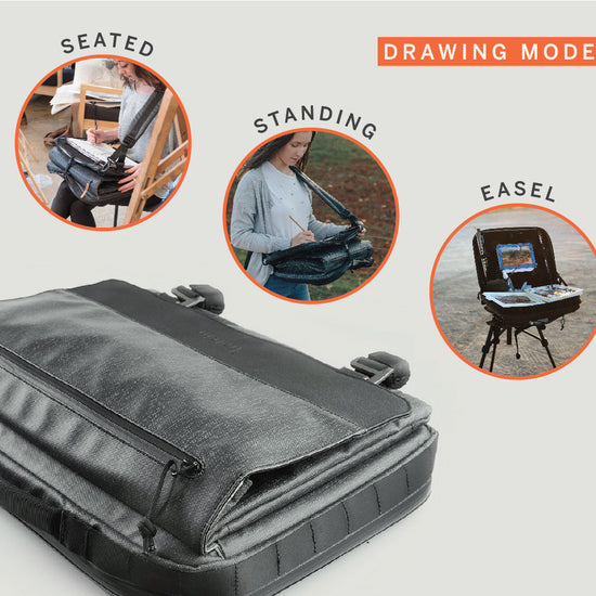 Designed by Australian artist and designer Darren Yeow (learn more below), the Etchr Art Satchel is the ultimate art bag. Built to carry your art gear wherever you may venture, the Art Satchel is in an expandable, weatherproof and modular system designed to adapt to your needs. It's perfect for either digital or traditional art-making, and it can be used as a backpack or a sling bag. Draw while standing, walking or sitting. Suitable for both left & right-handed artists.