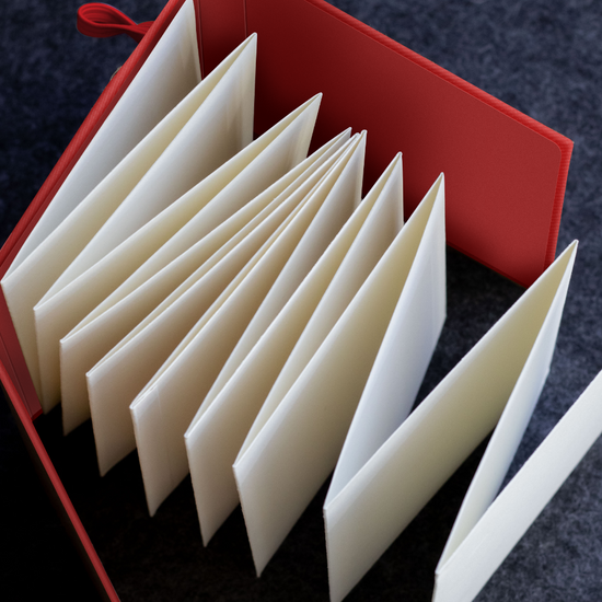 - Cover folds twice to protect pages and create a stable drawing surface