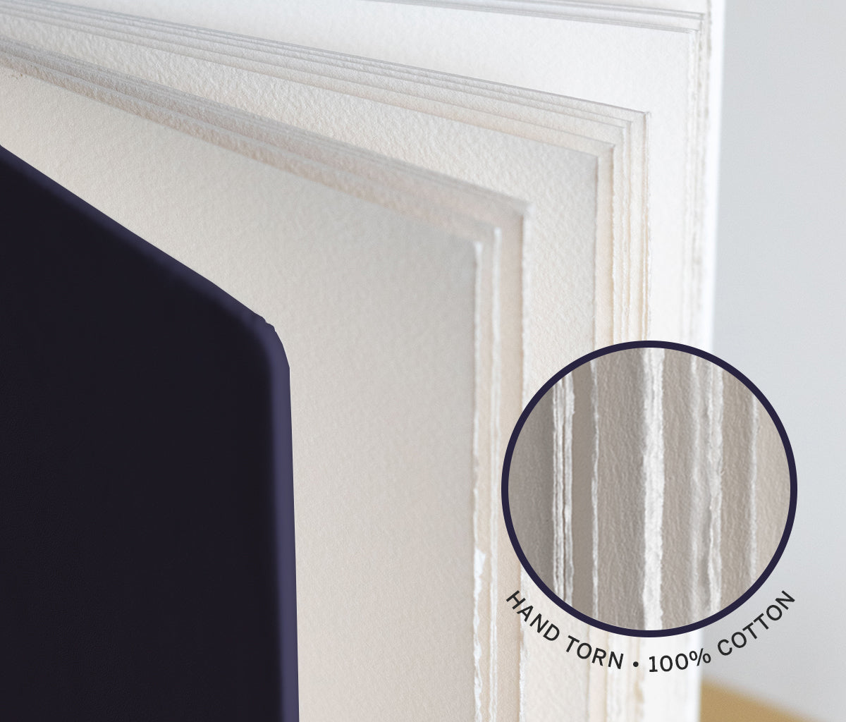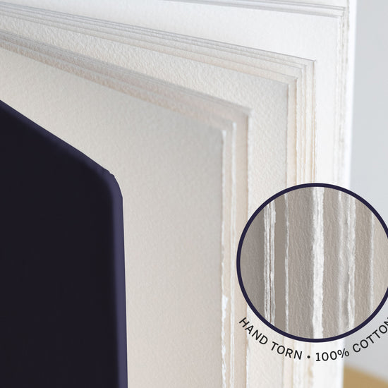B5 Portrait · 52 pages (26 sheets): 26 pages 220gsm Hot Press + 26 pages 230gsm Cold Press · 100% cotton, acid-free paper · Opens flat · Debossed vegan-friendly PU cover