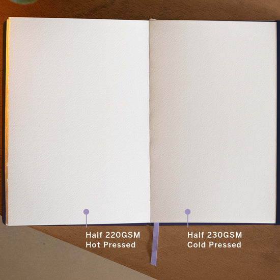 - 52 pages (26 sheets) of 100% cotton, acid-free paper (Half 220gsm Hot Press, paper, Half 230gsm Cold Press)