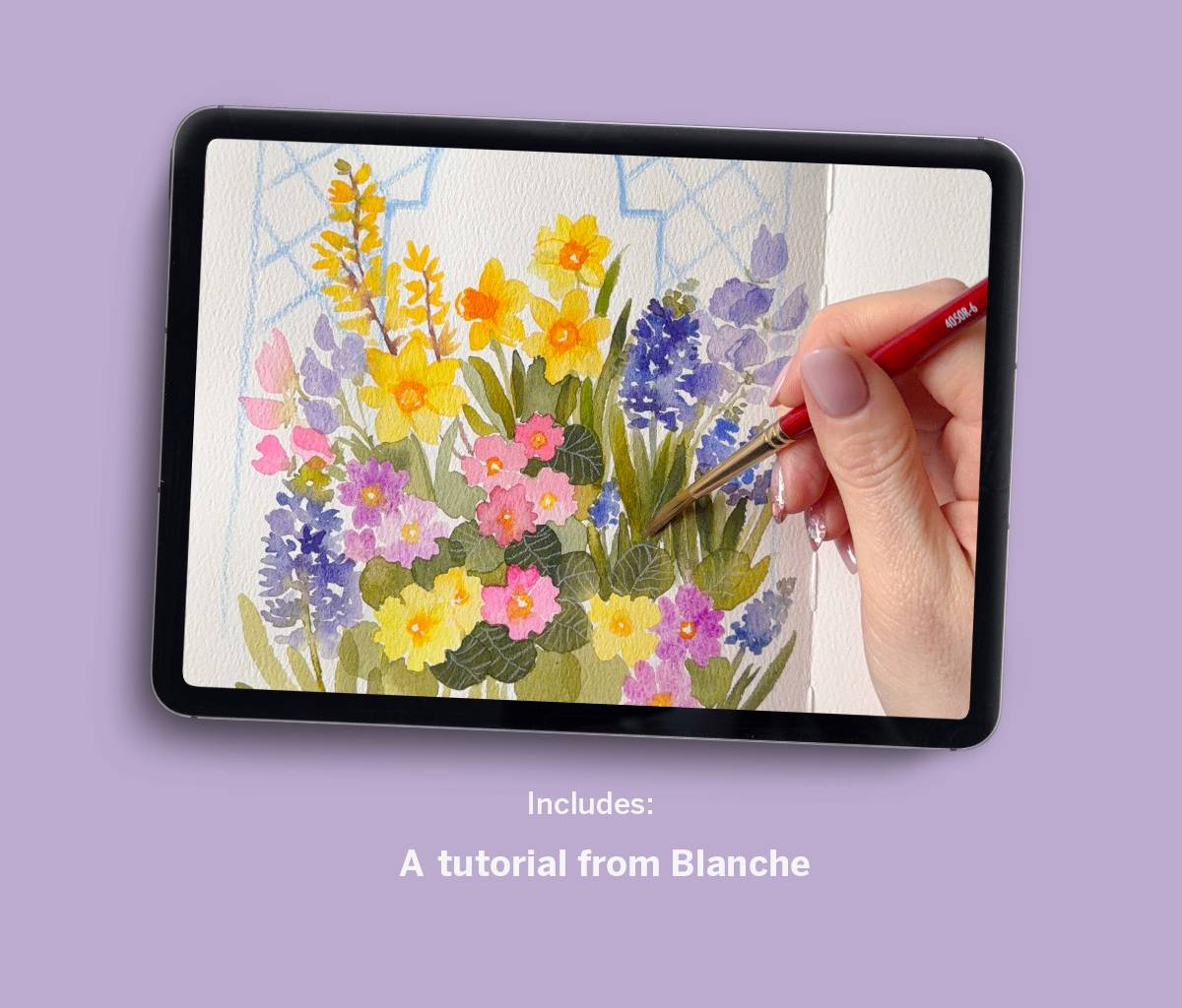 The recorded 40 minute tutorial walks you through how Blanche composes and paints one of her signature floral pieces, step by step. She shares her approach to building balanced botanical compositions, layering colour, and refining details — giving you insight into how she moves from first marks to finished piece.