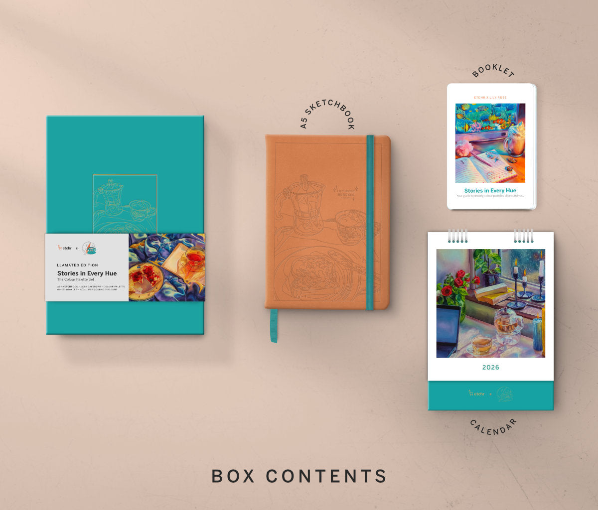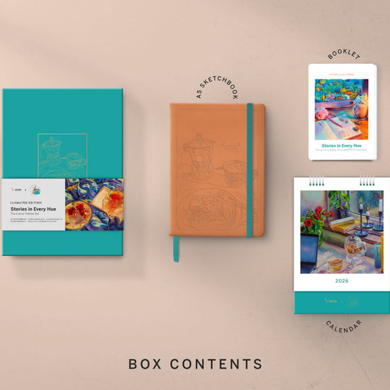Together with Lily, we created Stories in Every Hue — a set that helps you slow down, notice colour in your surroundings, and build confidence through creative exploration. It’s a hands-on way to bring Lily’s teaching to life: from the sketchbook that invites daily colour studies, to the calendar that keeps your eyes open to new palettes, and the guide that helps you turn observation into understanding.