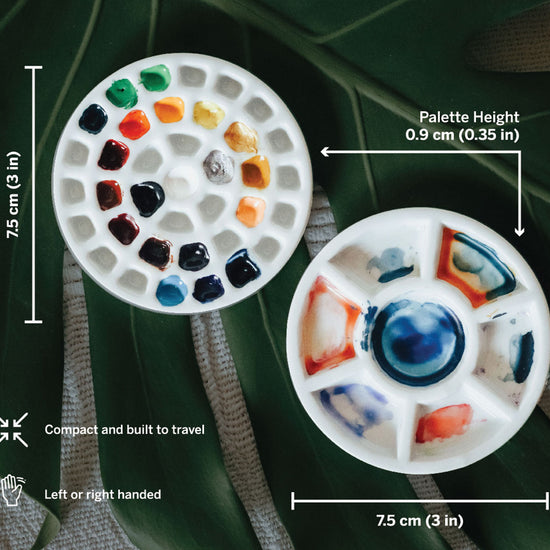 The Mini Palette colour wheel comes empty and ready for you to customize with your own selection of watercolours or gouache!