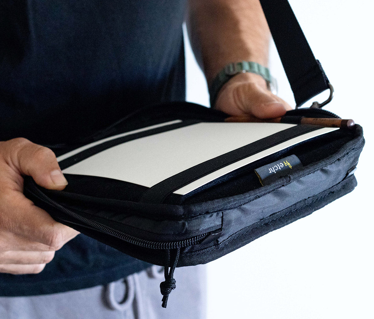 Darren’s initial bag design was unique in that the artist could quickly assemble a stable working platform on location, whether it was slung across the body, or attached to a tripod. After the success of this initial product, Darren wanted to turn his attention to designing more carry products for artists. This led to him joining forces with Yan and Simon to found Etchr. Etchr now ranges four carry products, each meticulously designed by Darren from his home studio in Melbourne, Australia.