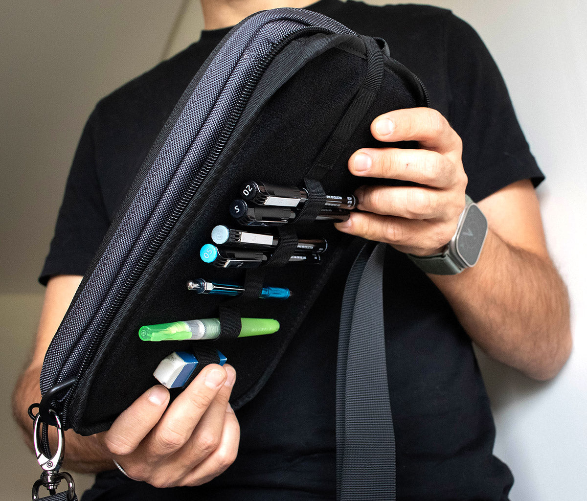 Our Nano Satchel comes with a built-in elastic Tool Strip and a Shoulder Strap.