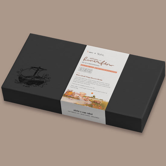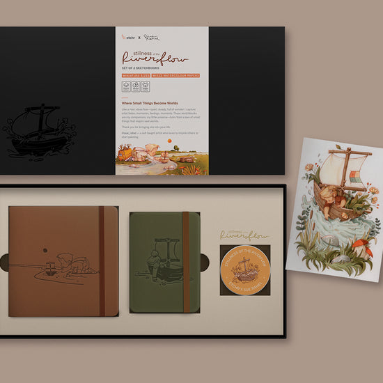 The Sue Rahel Riverflow Sketchbook Set is designed for artists who find joy in small things with big impact. This limited edition includes two premium sketchbooks in brown and green PU covers, one matching washi tape, an exclusive art print, and a recorded tutorial by Sue herself. Every detail is designed to reflect her delicate, imaginative style—and to support your own creative practice.