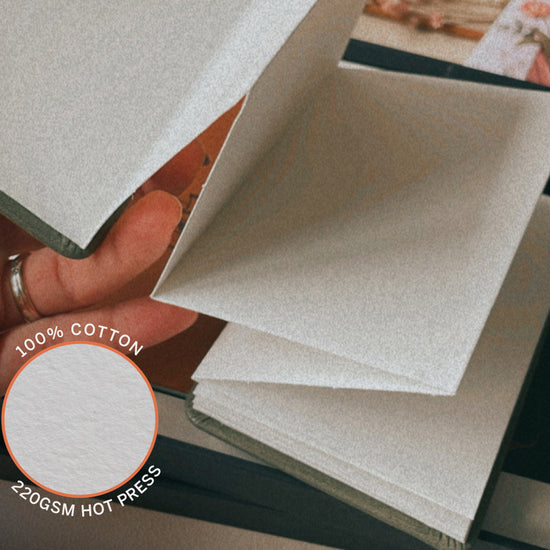 - 26 pages 220gsm Hot Press 100% cotton acid-free paper