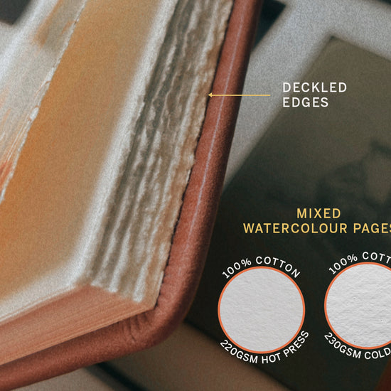- 24 pages 220gsm Hot Press + 24 pages 230gsm Cold Press 100% cotton acid-free paper (48 pages total)