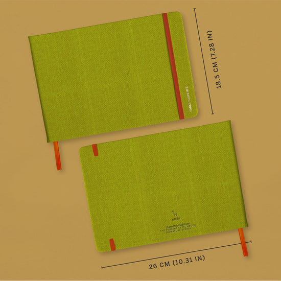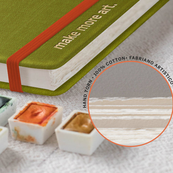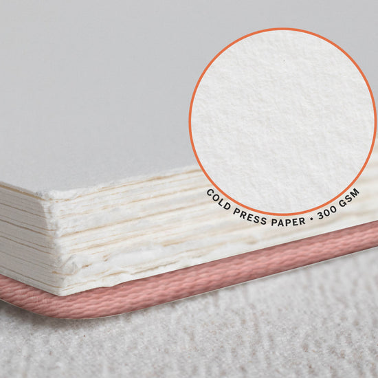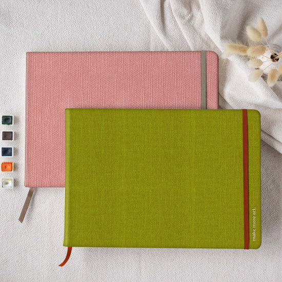 Designed for artists who favour wider compositions, horizontal studies, and uninterrupted washes, this format offers more breathing room while keeping the paper you already know and trust. Each sketchbook is finished with a textured, debossed vegan-friendly PU leather cover, complete with a subtle gold emboss detail, and is available in two community-chosen colours.
