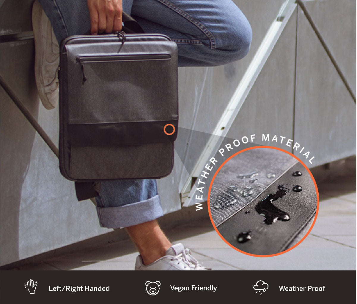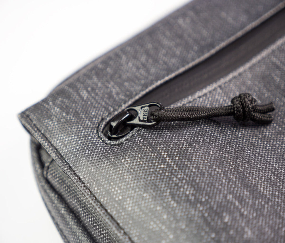 All components in this item are vegan friendly. The external material of the Slate Mini uses a dark grey polyester with black Toughtek front flap accents, and Toughtek for hardwearing areas. The internal materials are felt and ripstop material. The zips are YKK matte black water-resistant.