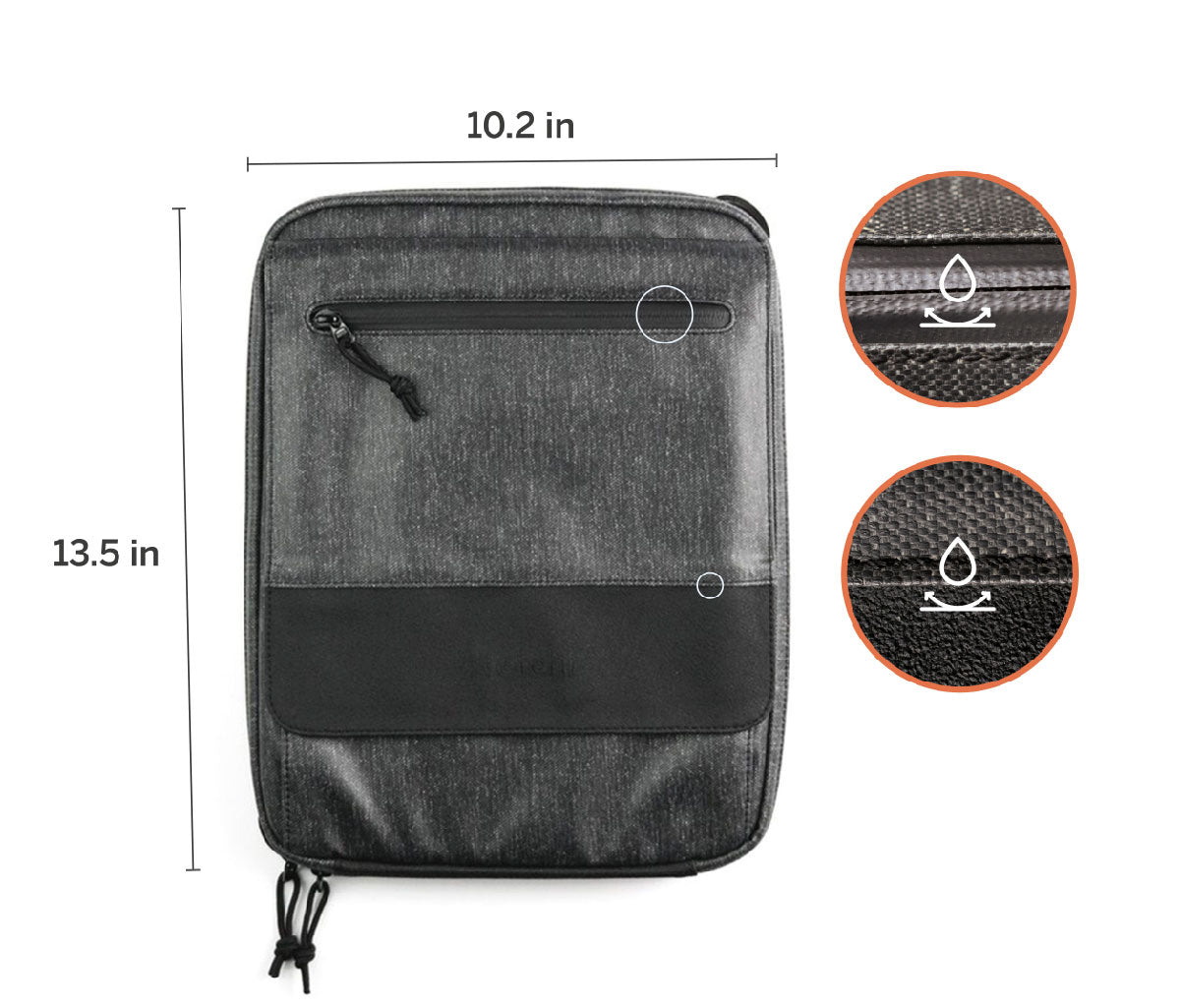 Our bags are water-resistant and have some waterproof components. Water-resistant is not the same as waterproof. Water-proofing is achieved by ultrasonically welding plastic panels together to create a watertight membrane - an extremely expensive undertaking that would likely triple or quadruple the price of our products if used. Water-resistance means that the item has a higher likelihood of keeping your possessions dry. The Polyester shell covering the outer surface of our products is waterproof and the Toughtek covering high-wear areas is waterproof. The zips and stitching are water-resistant. All these features work to greatly minimise moisture entering the internal compartments and damaging your belongings and art. However, our bags cannot be classified as waterproof strictly speaking. Nevertheless, one of our customers took his Slate Mini out during a Tropical storm and the results were amazing.
