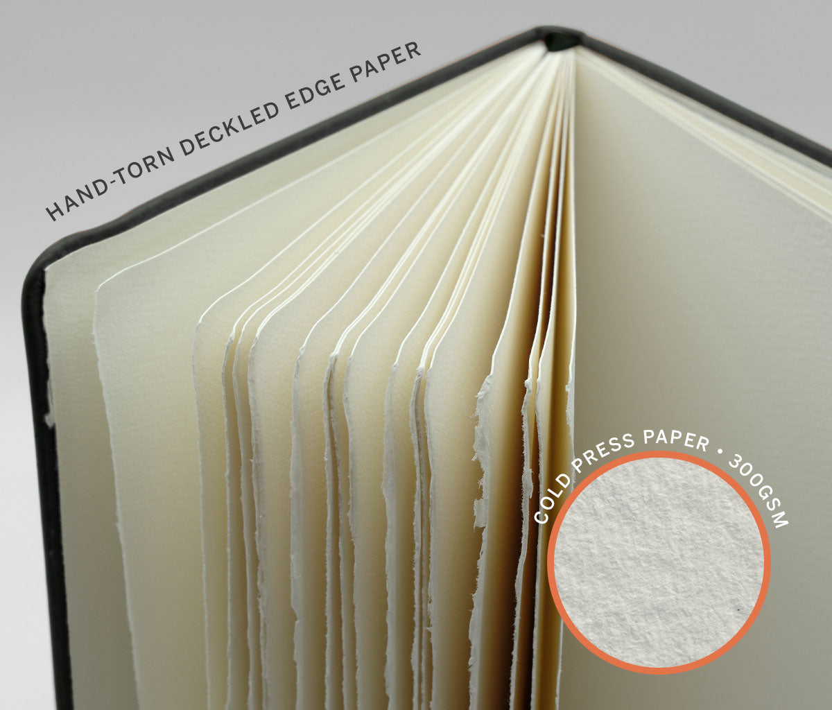 This sketchbook uses 300gsm (140lbs) acid-free, artist-grade, 100% cotton cold press paper. The paper tone is traditional white.