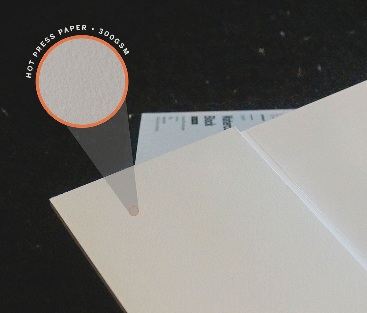 300g (140lbs) acid-free, 100% wood pulp hot press paper.